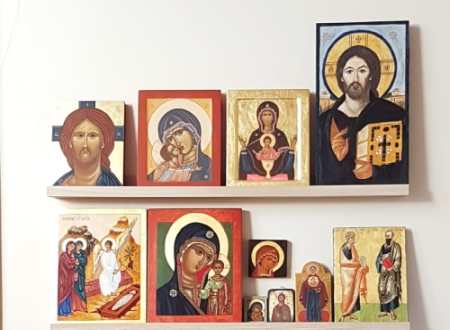 De er malet med ægtempera – (farvepulver rørt op i æggeblomme fortyndet med hvidvin eller vand og eddike) – på en træplade med gesso – (en blanding af harelim og kridt, der er poleret op, så det er lige glat som porcelæn). En enkelt af ikonerne har jeg malet med varm voks.